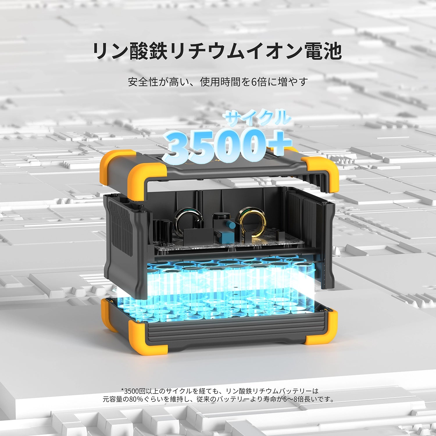 【6倍長寿命&3500回+サイクル】リン酸鉄リチウムイオン電池を採用しているので、充放電サイクル3,500回後も初期容量の80%以上を維持できます。業界平均500回より格段に長持ちです。1日1回の使用で約10年間以上の使用が可能です。また、リン酸鉄リチウムイオンバッテリーは、環境に有害な金属を使用しておらず、耐熱性にも優れており、高温下などの厳しい環境においても使用することができます。それに機体内には新型な材質が採用され、コンパクトが良くて衝撃の抵抗力が強い!