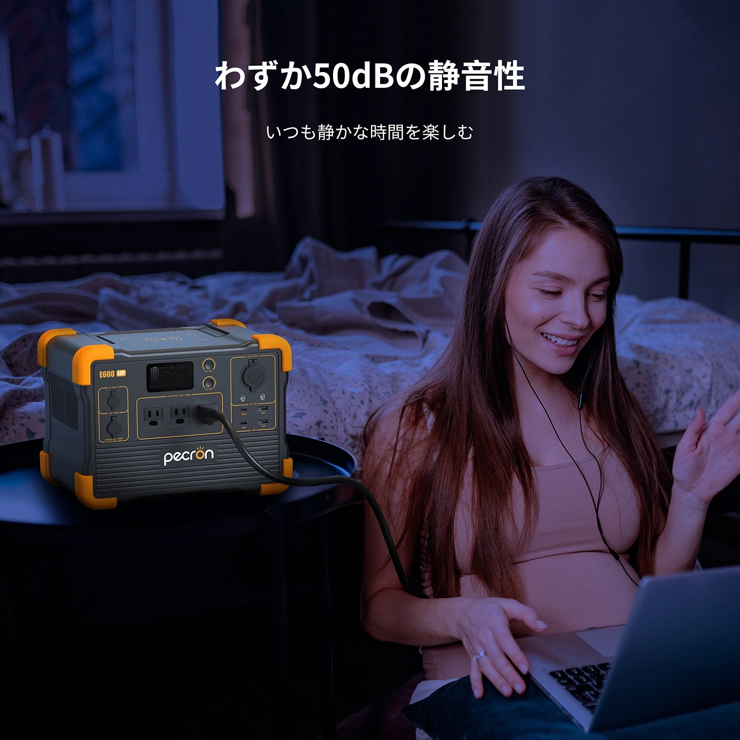 E600LFPは、優れた静音設計により、使用時の騒音を50dB以下に抑えました、キャンプ泊/車中泊のや室内の利用にもおすすめです。