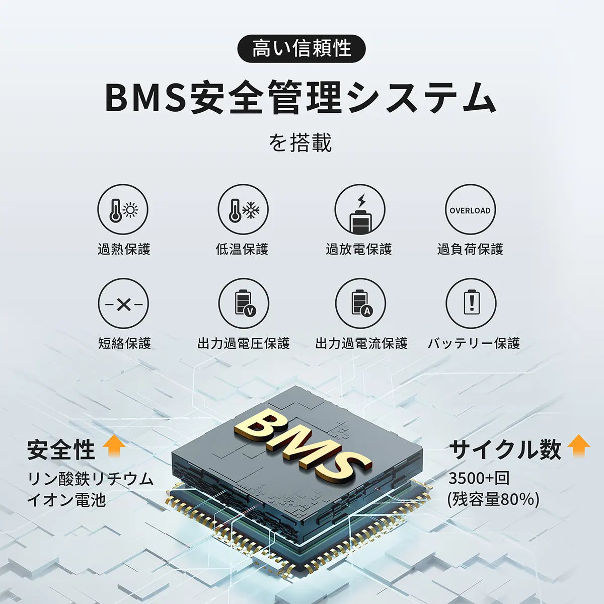 E600LFPは、BMSバッテリー管理システムを内蔵しているので、バッテリーモジュールのセル電圧、電流、温度を測定して、規定の範囲を超えた場合、出力端子を切り離し、過充電、過放電、過電流、過温などから保護することで、バッテリーの使用寿命を延ばします。