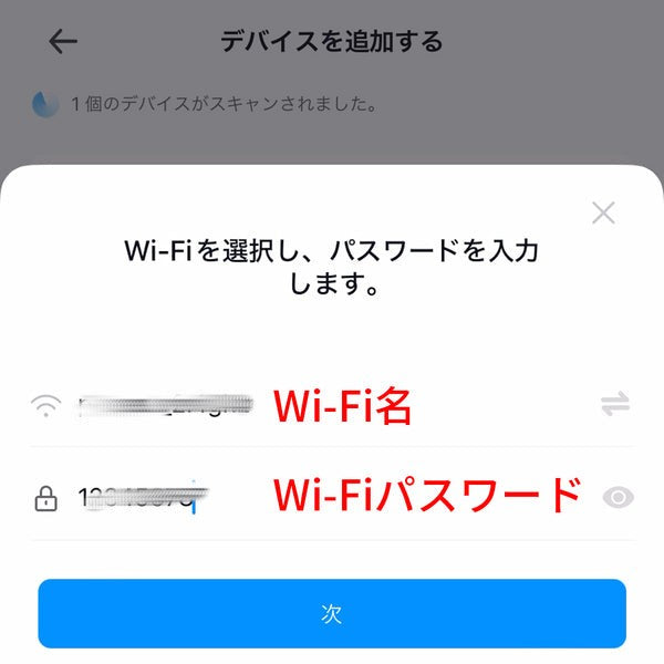 ご自宅の「Wi-Fi名(ネットワーク名)」や「Wi-Fiパスワード」を入力して、「次」をクリックすると接続開始。