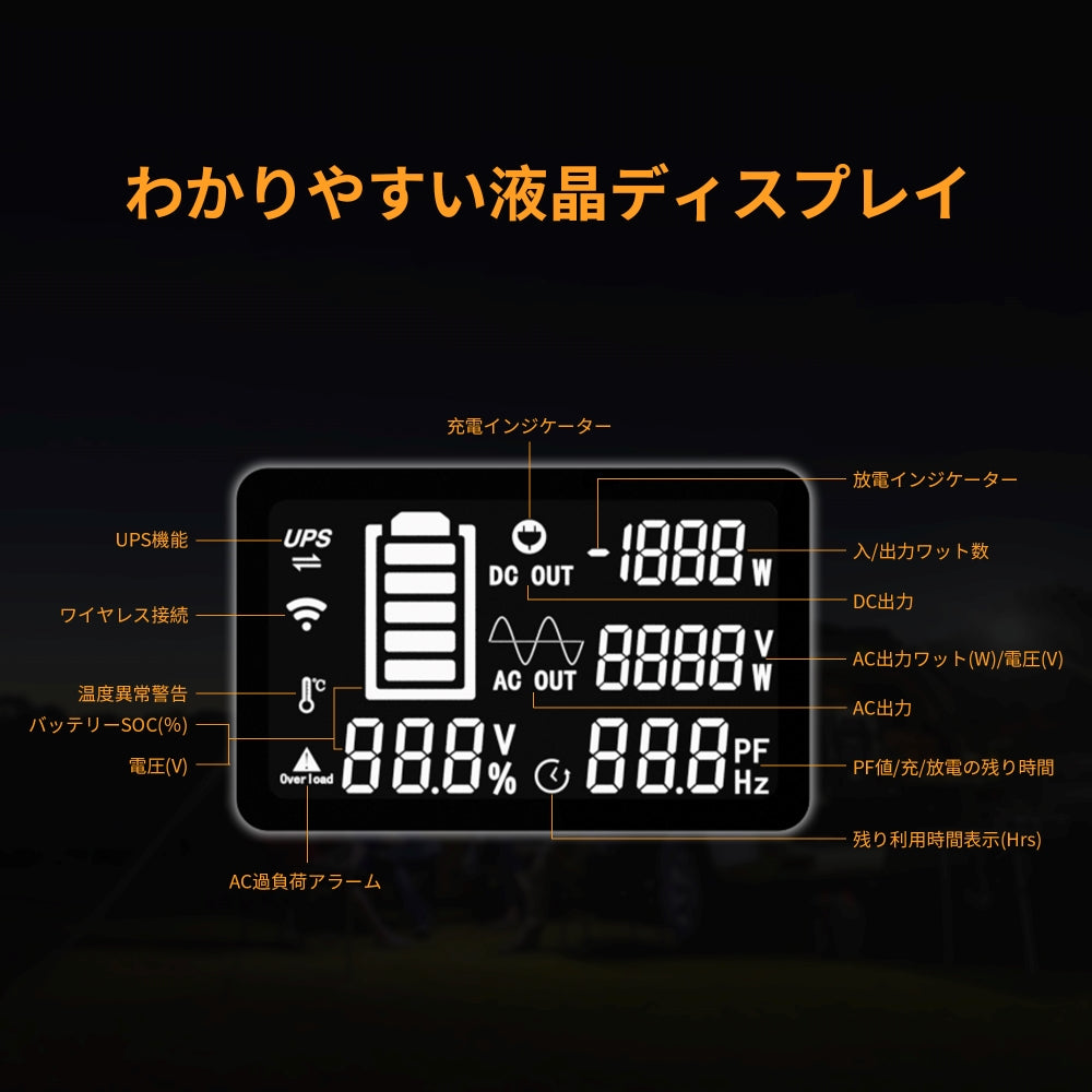 E1500LFPには、前面に大きな液晶ディスプレイを搭載し、日中の明るい場所でも夜間の暗い場所でも、視認性に優れており、充電 / 給電可能な残り時間や、本体が満充電になるまでの推定時間など、様々な情報を確認できます。電力を供給可能な時間が分かるので、計画的なご利用が可能です。