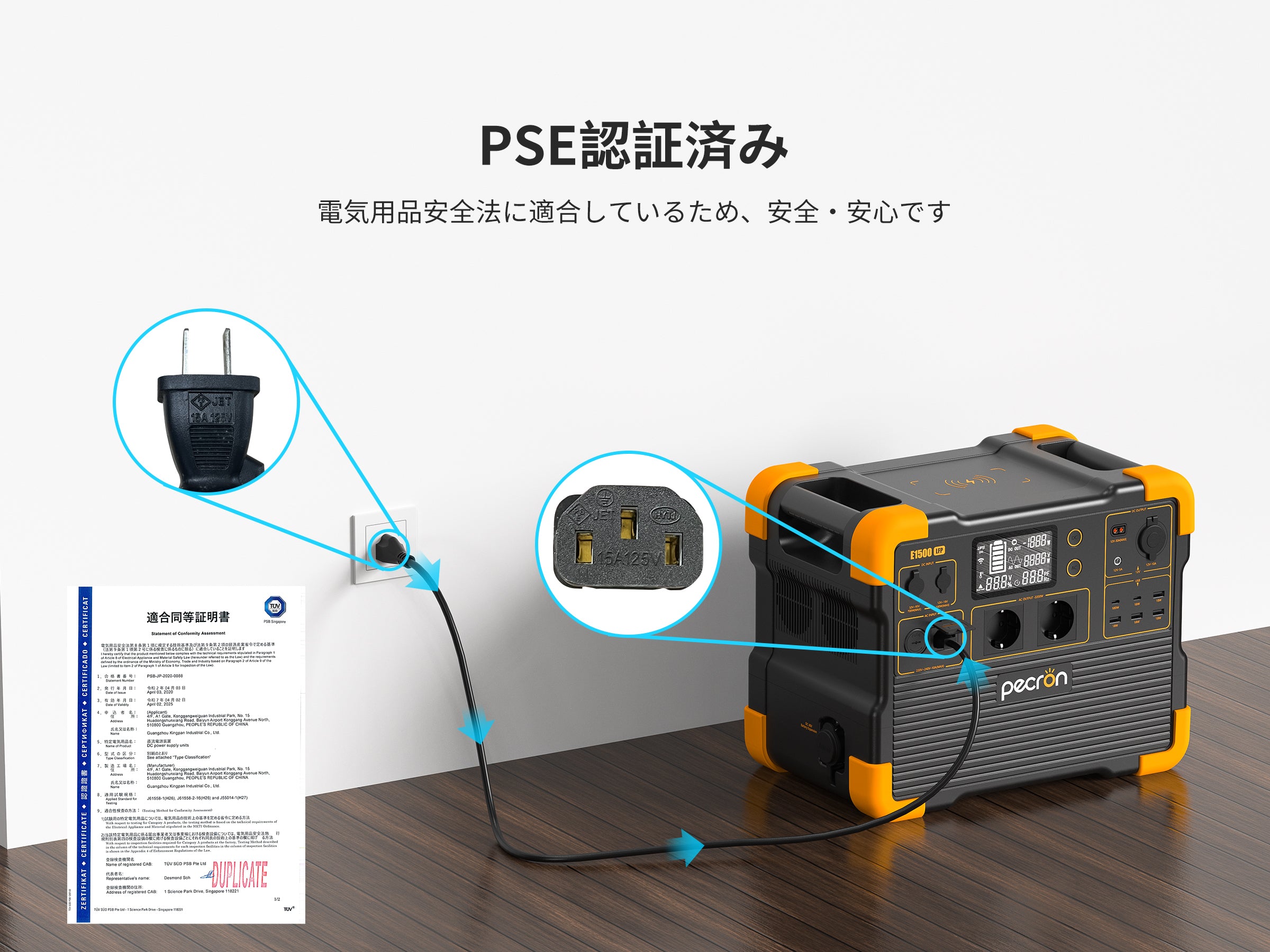 PECRON E1500LFPはPSE認証(電気用品安全法)を取得しており、AC充電ケーブル上にPSEマークを表示しています。安心してお使いいただけます。
