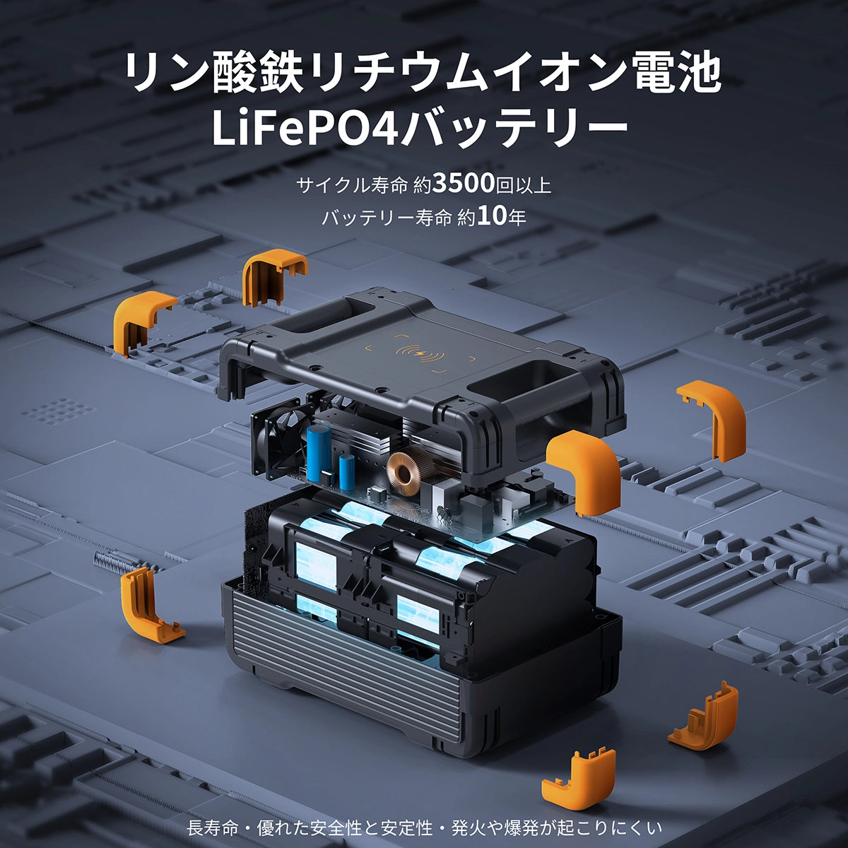 PECRON E1500LFPは寿命の長さと安全性の高さが特徴のリン酸鉄リチウムイオン電池(A級セル)を採用しているため、発火や爆発が起こりにくい、優れた安全性と安定性を実現しました。