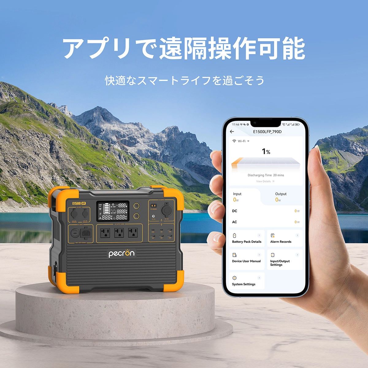 E1500LFPは、PECRON専用アプリをスマホ等にインストールすることで、遠隔から操作や状態確認を行うことができます。