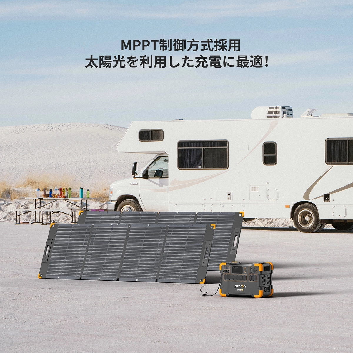 ソーラーパネル充電の場合、PECRON E2000LFP ポータブル電源はMPPT制御方式採用を採用しているため、2つの独立した24V-48V(開路電圧95V MAX)600WのMPPT充電コントローラーを内蔵し、24V/48Vのソーラーパネルで最大1200Wまでの充電に対応します。