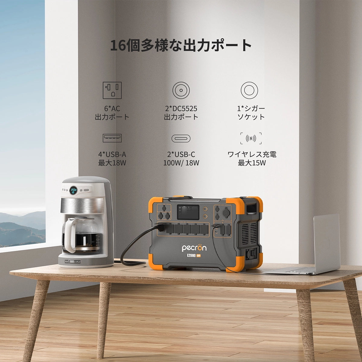 PECRON E2000LFP ポータブル電源は、6つのAC出力ポート(100V/60Hz)、4つのUSB-A出力ポート、2つのUSB-C出力ポート、2つのDC出力ポート、1つのシガーソケットと1つのワイヤレス充電器を搭載。最大16台の電気製品へ同時に給電することが可能です。