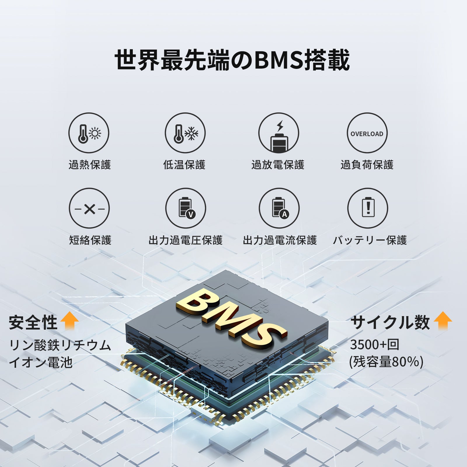 充放電サイクル回数は 3,500 回以上になります、3,500 回後も初期容量の 80%以上を維持できます。1 日 1 回の使用で約 10 年間以上の使用が可能です。